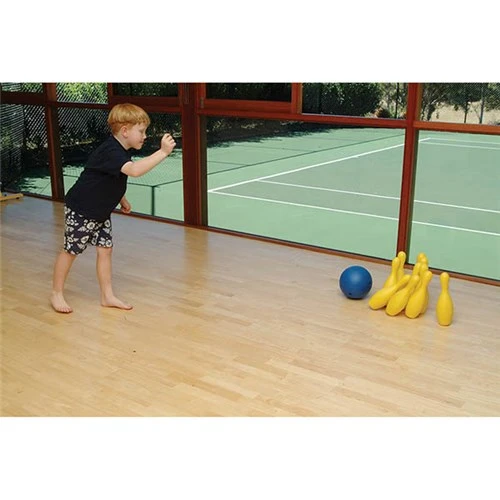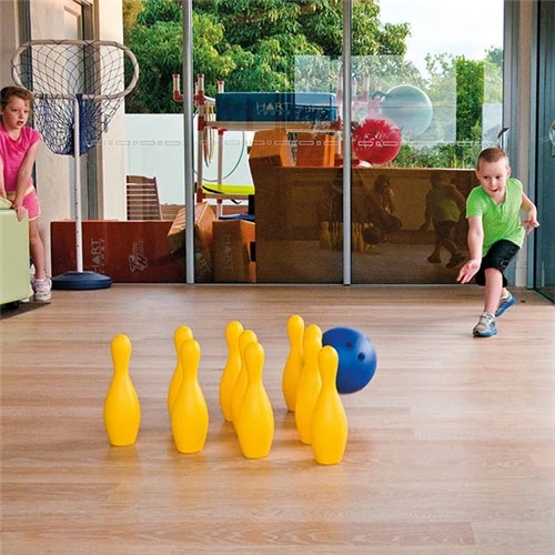 Modified version of ten pin bowling. Can be used on any level surface. Pins weighted for stability. Set includes: