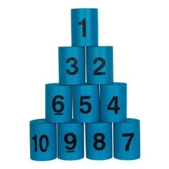 The HART Knock’em Down Foam Set includles 10 foam cans numbered 1 to 10 for scoring and four soft foam coated balls for throwing.