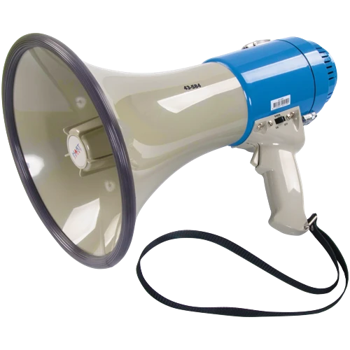 Hand grip style megaphone with volume control and siren. 25 watts. Takes 8 x Size C batteries. Audible range 500m to 700m depending on operating conditions. Siren 105dB. Speaker 100dB. Batteries not included.