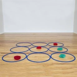 The Relay Tic Tac Toe Kit includes all the equipment you need to set up a relay style game including 9 Flat Hoops to create the game board, 2 sets of coloured beans bags for the game pieces, a ‘START’ line, and a HART Hoop Bag to keep everything neatly packed away.Â