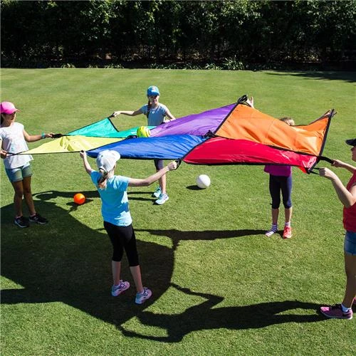 The HART Team Partner Parachute is made up of 6 different coloured pieces that can be used individually or attached together with velcro to make one large parachute.  Parachute play is an enjoyable way for children to develop motor coordination, team play and collaborative decision making skills. As children become more confident you can add additional balls and games to keep them enticed.Â